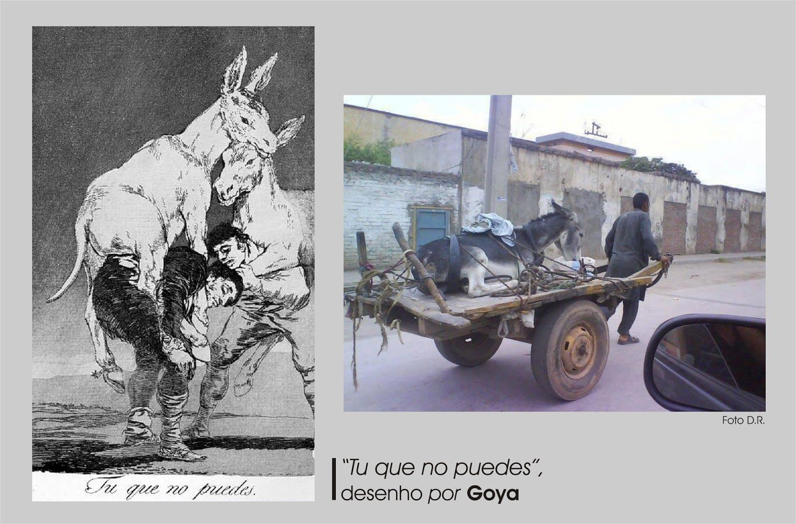 Também na série de gravuras «Los Caprichos» de Francisco José de Goya, «a misoginia, a apatia da nobreza, a ignorância do povo e o abuso do poder do clero» (Nunes, 2013) são representadas satiricamente, fazendo uso da representação de animais de carga, os burros. Estes animais até à contemporaneidade irão adquirir e personificar toda a carga simbólica que a caracterização caricatural e satírica da sociedade espanhola do final do século XVIII lhes conferiu.