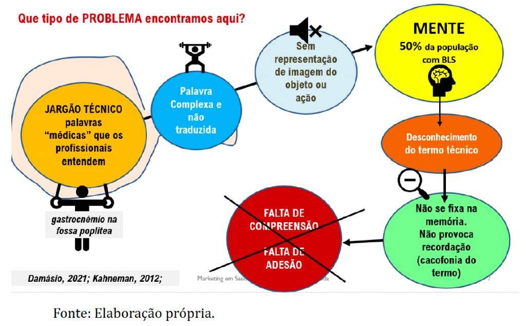 Representamos na Figura 2 este fluxo de um “jargão técnico” por exemplo as palavras “gastrocnémio na fossa poplítea”, (expressão encontrada num site de saúde e bem-estar e por isso para a população em geral) e o seu efeito na mente de uma pessoa com baixa literacia em saúde, de acordo com o que é analisado na literatura, por exemplo por Damásio (2020) e por Kahneman (2012).