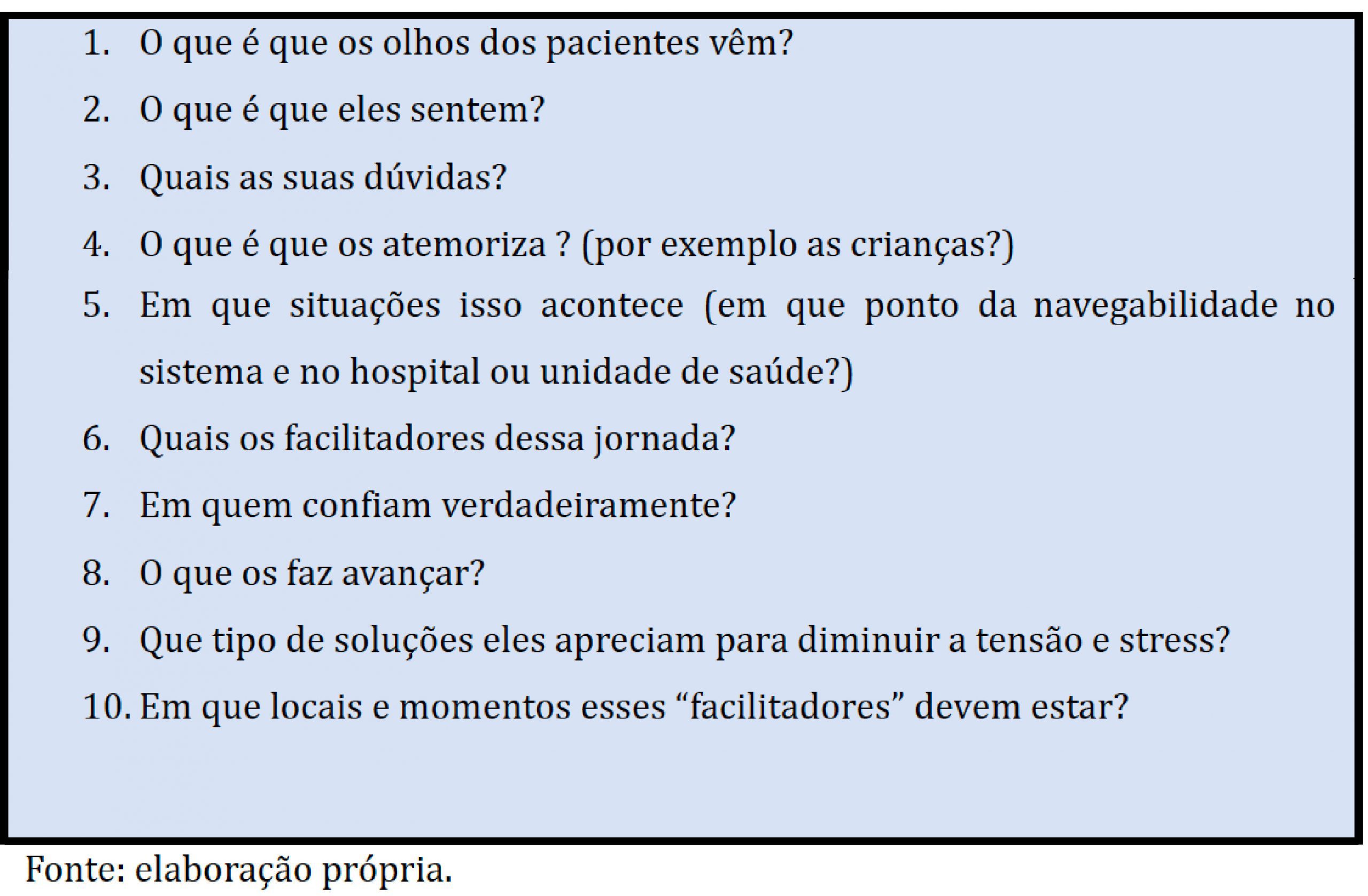 Neste desafio constante para as organizações, estas precisam de entender a experiência dos seus pacientes, não apenas em qualquer ponto de contato, mas em toda a jornada do paciente. Sentir, vivenciar diretamente pelos olhos dos pacientes é uma das formas de se identificar quais as áreas de melhoria e também de criação de novo valor. As perguntas a serem feitas nesta “jornada do paciente “ podem ser (tabela 2):