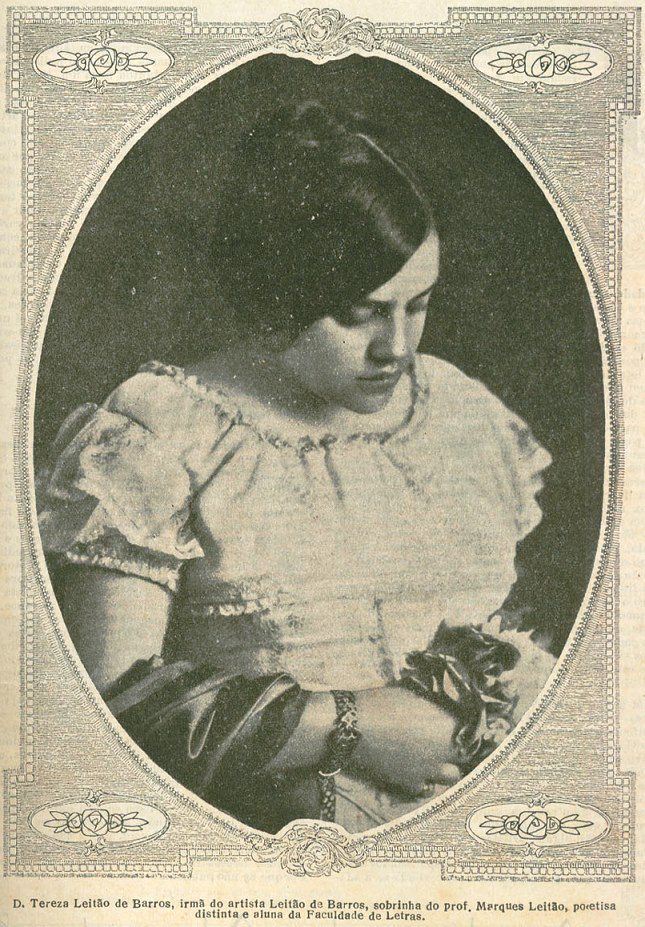 A poeta seguinte, Theresa Emília Marques Leitão de Barros (1898-1983) que nasceu e morreu em Lisboa, em vinte e quatro formara-se em filologia românica, no ano seguinte a esse do sarau, será feita dama da Ordem de Sant’Iago da Espada, em cinco de outubro, esses nomes tinham um traço em comum, pugnavam todas pela emancipação da mulher, sendo Theresa um destacado nome nessa luta, autora de muitos livros, foram o seu Caderno de gramática portuguesa, e os seus contos infantis da Varinha de condão, os mais conhecidos dentre eles, sendo a muito conhecida crítica literária do Notícias Ilustradas, que em trinta e cinco verá grande valor no livro de Ferreira de Castro, A Selva. Theresa Leitão de Barros era irmã do cineasta e pintor José Júlio Marques Leitão de Barros (1896-1967) sobretudo aguarelista, que era casado com Helena, a filha de Roque Gameiro, o outro irmão era o tenente Carlos Joaquim, sendo todos, gente que se movimentava muito na sociedade dessa época. Sua quadra que refere o dia da semana do sarau, é a seguinte: