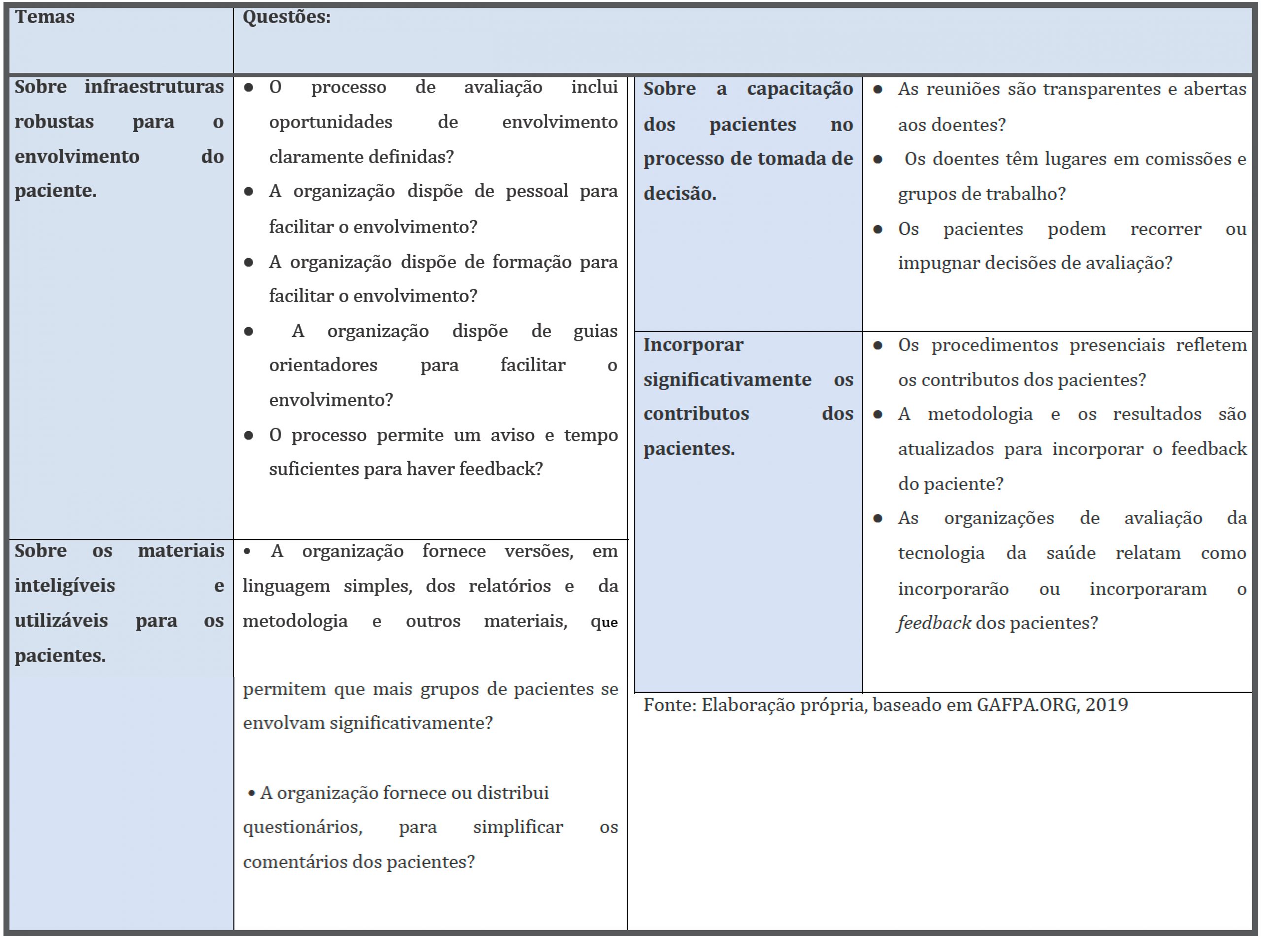 A Aliança Global para o Acesso do Paciente (2020) avaliou como, e quão bem, os diferentes países incorporam a participação dos pacientes nos processos tecnológicos e reviu práticas de avaliação de tecnologia de saúde. Nesse âmbito, e colocou um conjunto de questões sobre as infraestruturas, os materiais de comunicação e a capacitação dos pacientes, para poderem participar efetivamente (Quadro 1).