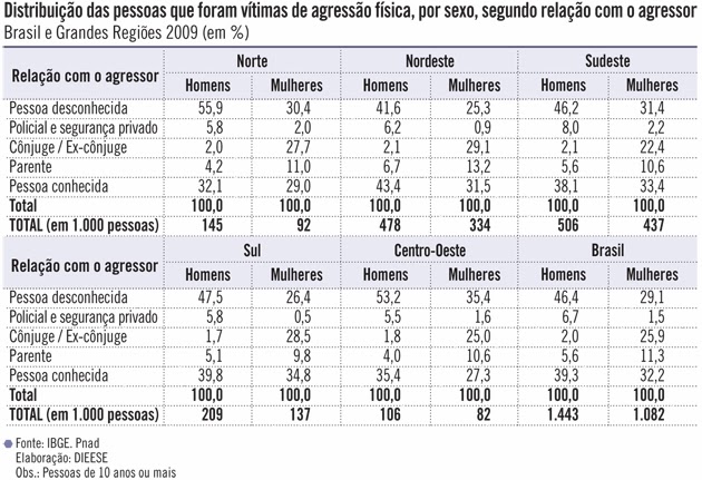 Segundo o IBGE (Instituto Brasileiro de Geografia e Estatística) as formas de agressão física por gênero no Brasil podem ser assim distribuídas: