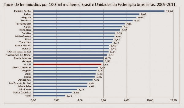 - De acordo com os dados do documento, o Espirito Santo é o estado brasileiro com a maior taxa de feminicídios, 11,24 a cada 100 mil, seguido por Bahia (9,08) e Alagoas (8,84).