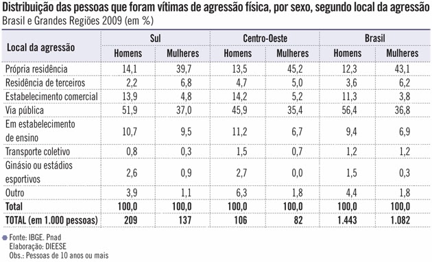 O dado aqui é contundente: o maior índice de agressão contra a mulher ocorre em casa, em 43% dos casos na Região Norte, 47% na Região Nordeste e 40% na Região sudeste do Brasil. Respectivamente os índices caem vertiginosamente para o gênero masculino, ou seja: 11% na Região Norte, 12,9% na Região Nordeste e 10,9% na Região Sudeste.